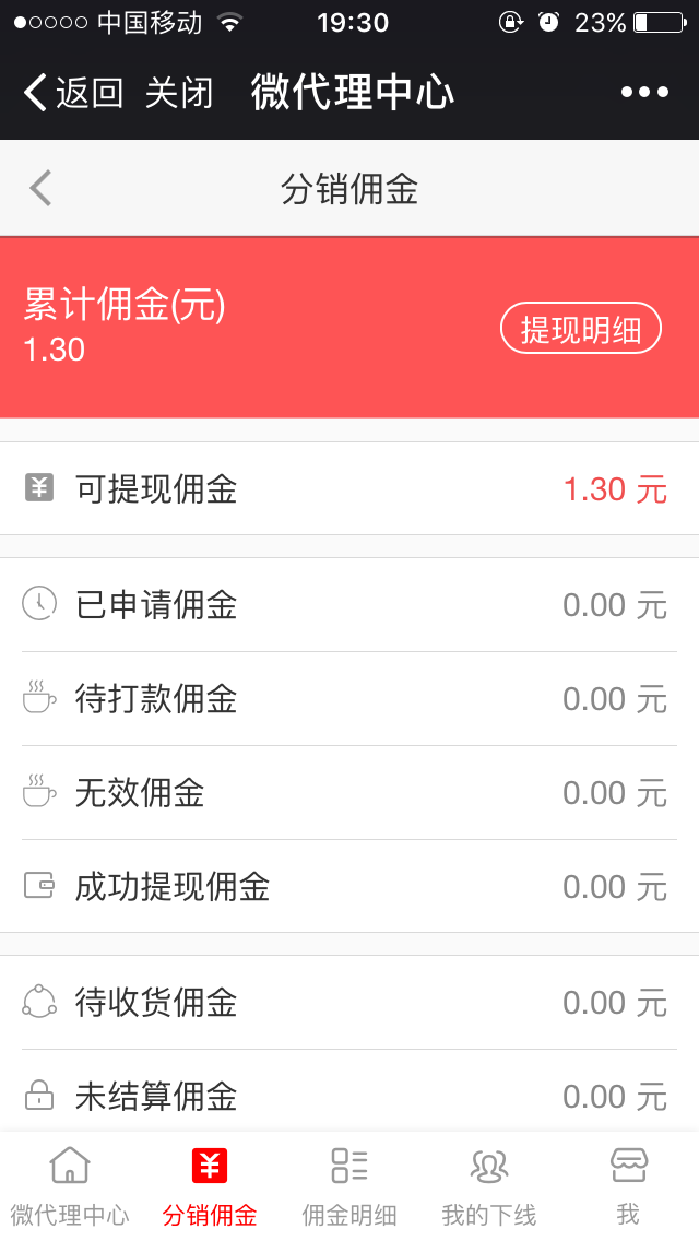 傭金管理支持按照分類查看傭金審核:待審核、待打款、已打款、無效提現(xiàn)等;支持分銷商查看傭金總額及明細(xì)